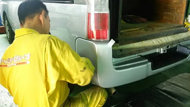 リアバンパーのヘコみ修理のご依頼をいただきました。リアバンパーの新規取り換えで対応しております。
